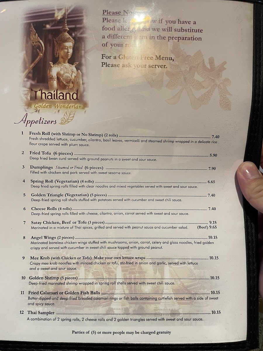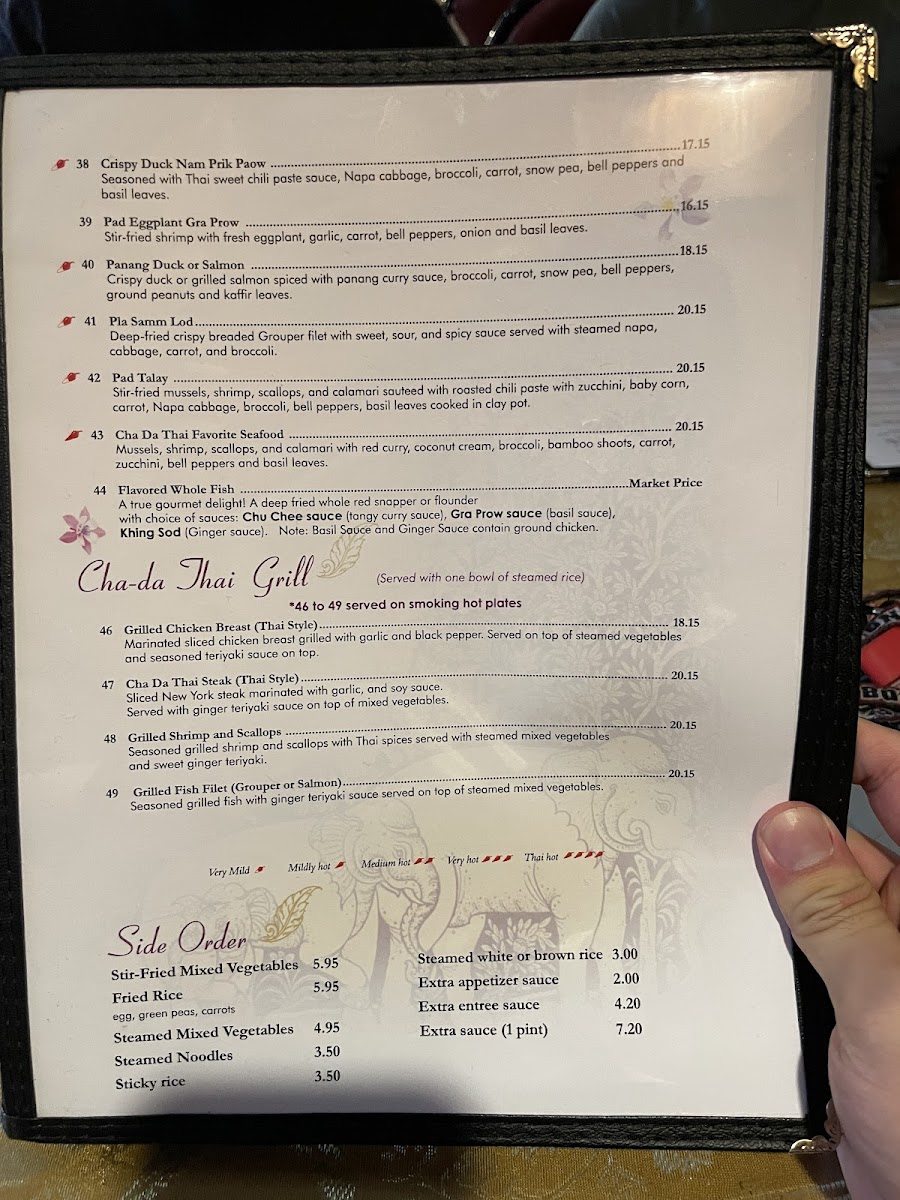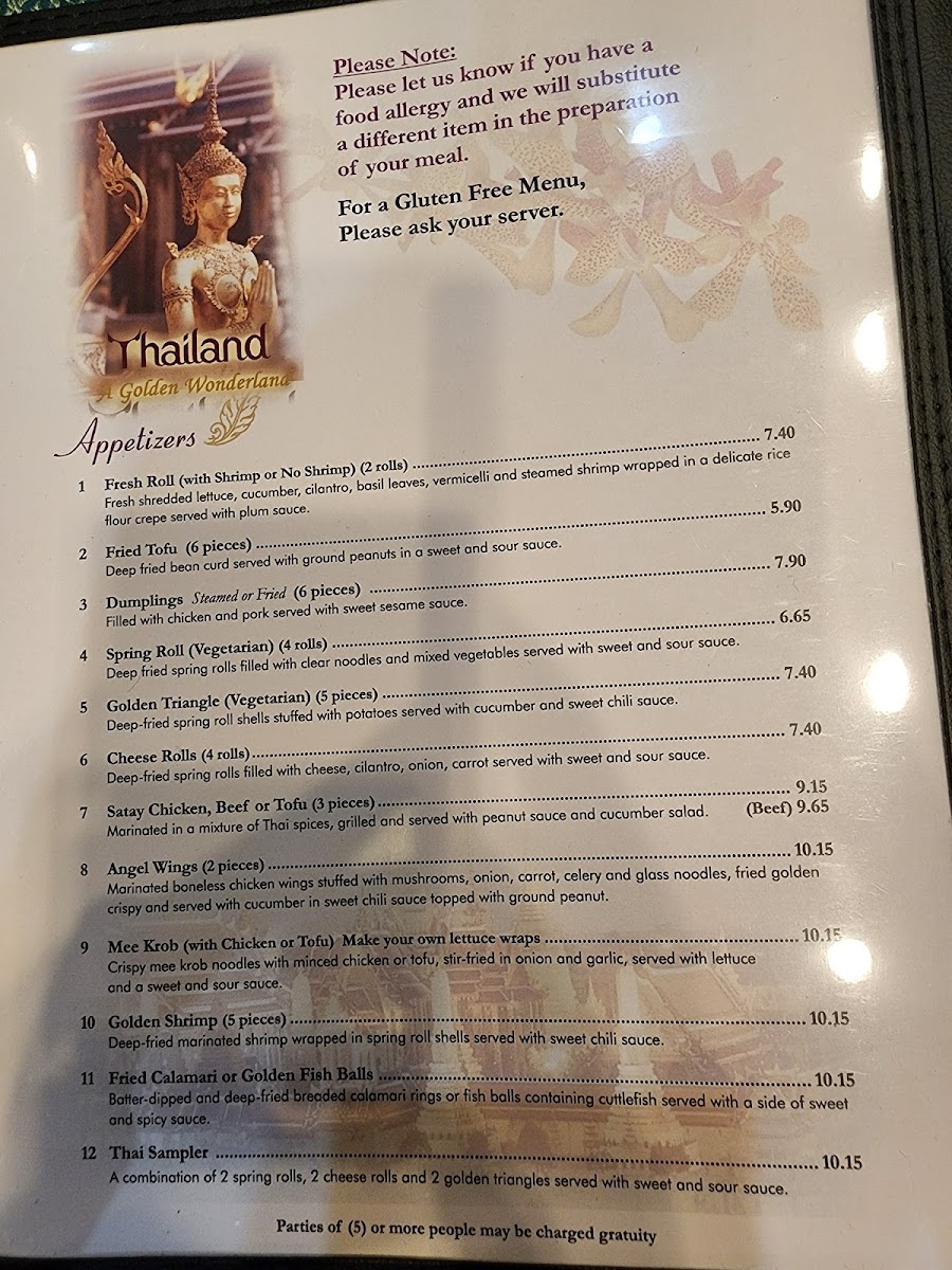 A true gourmet delight! A deep fried whole red snapper or flounder with choice of sauces: Chu Chee sauce (tangy curry sauce), Gra Prow sauce (basil sauce), Khing Sod (Ginger sauce). Note: Basil Sauce and Ginger Sauce contain ground chicken