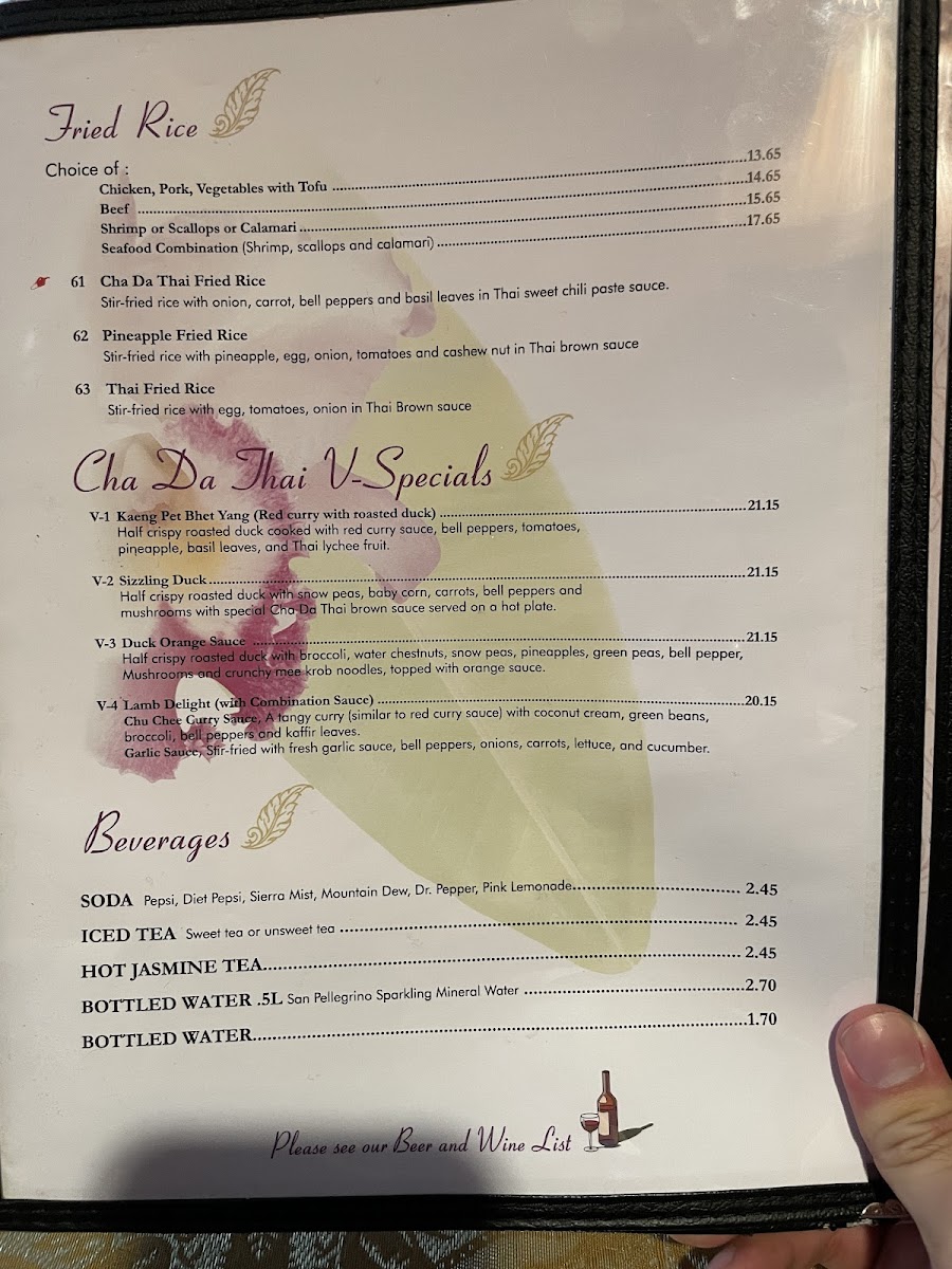 Half crispy roasted duck with snow peas, baby corn, carrots, bell peppers and Mushrooms with special Cha Da Thai brown sauce served on a hot plate